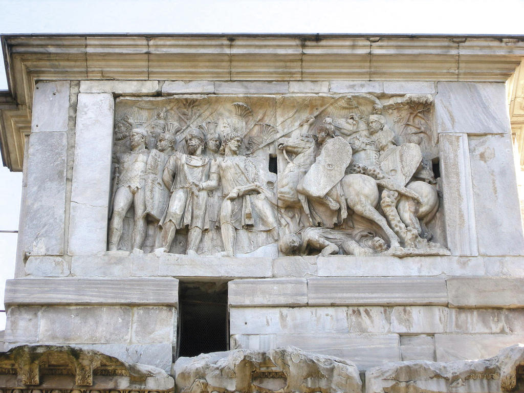 Fragment de la grande frise de la basilique Ulpienne réemployé sur l’arc de Constantin. DR