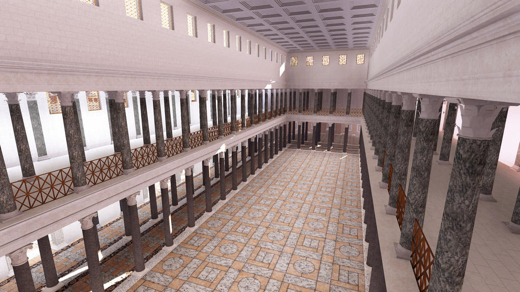 Proposition de restitution de l’intérieur de la basilique Ulpienne. Infographie Ch. Morineau, N. Lefèvre, 2013. © Université de Caen Normandie, CIREVE, Plan de Rome