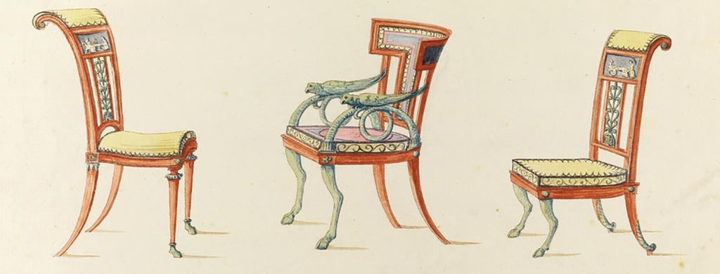 Récemment le musée des Arts décoratifs a acquis un lot de trois dessins5 que l’on peut rapprocher des précédents, l’un d’entre eux figurant un modèle de siège encore plus proche de ceux sur lesquels est assis le couple. On y observe les quatre pieds à l’étrusque, une ceinture identique avec un petit quart de rond présent uniquement sur la traverse avant, le dossier à planche légèrement incurvée avec une bande de papier peint figurant une scène à l’antique, une traverse médiane au niveau de l’amortissement des bras d’accotoirs d’avec les montants latéraux du dossier. Seule différence à noter, le dessin propose une sorte de tête d’oiseau à long bec. Ces trois dessins portent, en plus d’une mention manuscrite les désignant comme des fauteuils et guéridons antiques, une autre mention manuscrite beaucoup plus discrète dissimulée au niveau de la ceinture de chacun de trois des sièges indiquant « Jacob » et pour l’une précisant « Jacob rue Meslée ». Le doute n’est plus permis de voir en ces dessins des modèles, d’autant que l’un des fauteuils représentés sur l’une des feuilles n’est autre que le modèle de ceux fournis pour l’ameublement du grand salon de la marquise de Marbeuf dans son hôtel rue du faubourg Saint-Honoré, commande passée à Georges Jacob vers 1788. Ces différents dessins et le tableau témoignent ainsi des innovations à mettre au crédit de Georges Jacob puisant aux sources de l’antique et que François-Honoré allait développer à son tour. Le petit tabouret de pied au premier plan en bas à droite est plus classique, tout comme la chaise sur laquelle est assise Marie-Victoire, à pieds cannelés en fuseau, également en acajou et recouvert d’une étoffe verte à l’unisson du grand rideau de la fenêtre.