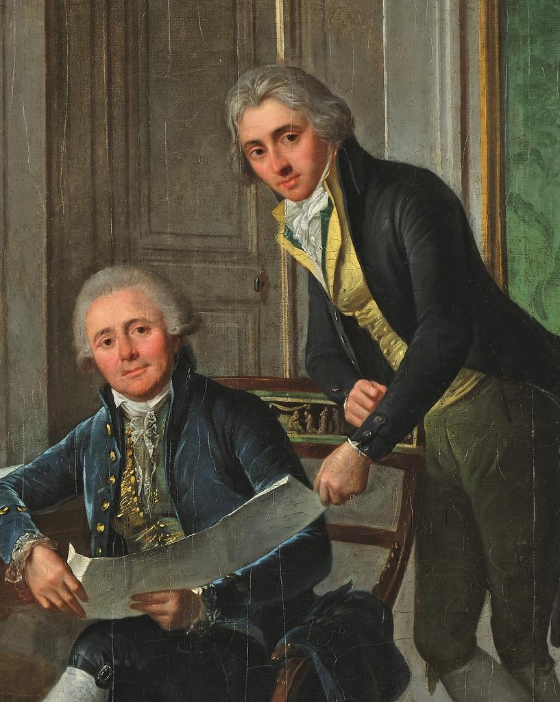 Il représente en effet trois des principaux artisans du meuble qui marquèrent pendant près d’un siècle la production de la menuiserie et de l’ébénisterie française. Ce sont les dernières recherches conduites par Xavier Bonnet (†) sur Georges Jacob (1739-1814) qui ont permis de localiser le tableau. Cette huile sur toile, signée de Lepeintre, datée de 1792, constitue au regard de l’histoire des arts décoratifs un document d’une extrême importance. Il confirme non seulement la notoriété acquise par Georges Jacob mais également l’ascension sociale qui fut la sienne, comme en témoignent l’élégance de son intérieur et les vêtements à la dernière mode portés par l’ensemble des protagonistes.