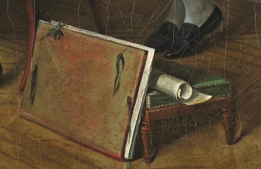 « En bas à droite de la composition, un carton à dessins et un dessin roulé reposent sur un tabouret de pied, rappelant le rôle de créateur de modèles que furent les Jacob père et fils. »