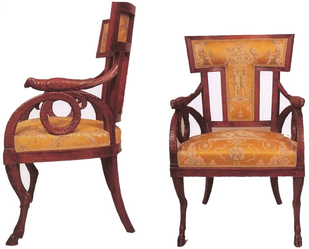 À commencer par le mobilier et notamment la représentation des deux fauteuils sur lesquels sont assis Georges Jacob et son épouse. En acajou, ils rappellent le rôle pionnier que le menuisier joua dans l’emploi de ce bois dans le domaine du siège. Ils offrent également un exemple précoce d’un modèle que Jacob et ses fils développeront sous le Directoire : le siège à pied à l’étrusque, au dossier ajouré légèrement incurvé dont la partie supérieure est à planche dont la face interne est ornée d’une frise de papier peint figurant des personnages à l’antique. La partie la plus originale de ces fauteuils est constituée par les accotoirs que l’on devine sous le pan de l’habit porté par Georges Jacob. Il s’agit d’un modèle de bras de fauteuil dont l’accotoir est orné d’une levrette dont la tête et les pattes pendent devant et dont le corps se termine à l’arrière par un enroulement serpentin remontant le long de la traverse du dossier. Cet accotoir, pour le moins original, est à rapprocher d’une paire de fauteuils estampillés de Georges Jacob, conservée en collection privée, présentant des bras d’accotoirs sur ce principe mais se terminant par une tête d’oiseau. Une décennie auparavant, le menuisier avait déjà introduit dans le traitement de ses bras d’accotoir une certaine fantaisie par la présence d’une tête de dauphin associée à une figure de sphinx pour les fauteuils du boudoir de la reine à Fontainebleau ou encore d’une tête de chien pour ceux de son boudoir à Versailles. L’acajou se prêtant bien à la sculpture, le menuisier développa ce parti qui trouve son origine ou qui furent diffusés par un ensemble de dessins anonymes, datables des années 1790, offrant tantôt le parti de bras d’accotoir formant enroulement sur lesquels l’accotoir est figuré par un oiseau4 ou même en forme de serpent.