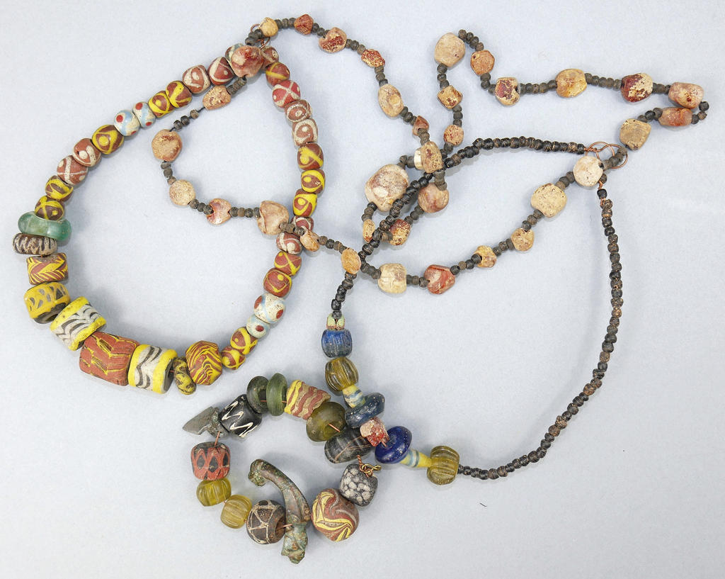 Comme aujourd’hui, les vêtements et les parures sont des marqueurs de l’identité sociale. La quantité et la qualité des tissus et des bijoux des sépultures du premier Moyen Âge renseignent sur la richesse et parfois l’origine des défunts. On y décèle également le soin de suivre les modes qui évoluent, au gré des changements liés aux courants commerciaux. Si les perles en pâte de verre sont de fabrication locale, celles en ambre sont importées des rivages de la Baltique. Le bracelet associe deux éléments en alliage cuivreux provenant du réemploi d’un rivet et d’un fragment de boucle de ceinture du IVe siècle.