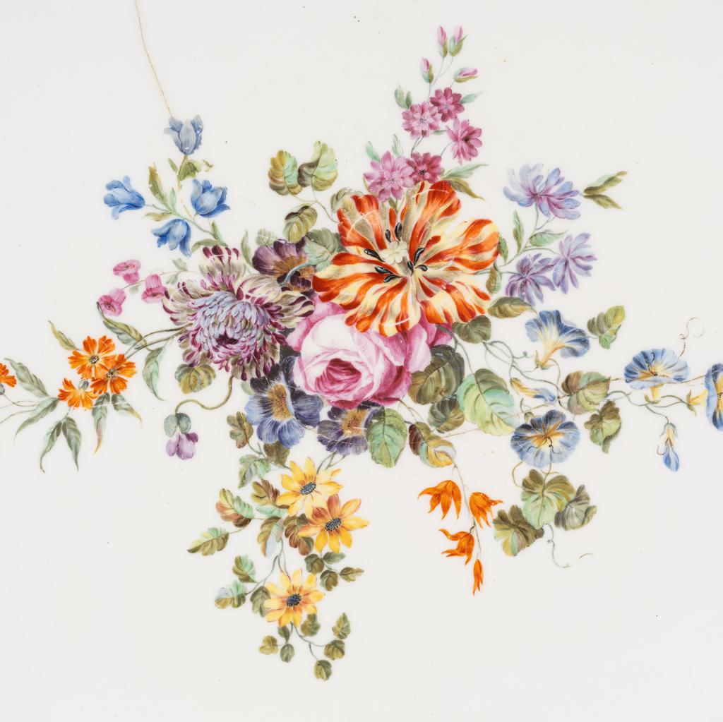 Grâce au soutien des Amis de Versailles, le château vient donc d’acquérir à prix céleste — 332 800 € (frais inclus) — l’une des 1749 pièces4 de cette fastueuse vaisselle, et pas n’importe laquelle ! Il s’agit d’un « grand plat ovale »5 livré en 1755, la plus grande pièce du service, qui compte également parmi les plus grandes porcelaines jamais produites par Vincennes. Surtout ne pas se fier à son apparente sobriété, ni à la simplicité du décor ; le luxe est dans les détails. Ce modèle, d’une virtuosité inimaginable, coûtait la bagatelle de 840 livres. Ses dimensions, 60 x 45 cm, repoussent alors les limites techniques des ateliers et dépassent même les dimensions des fours : pour entrer en largeur, notre plat devait être disposé en biais grâce à un astucieux pupitre. Pas moins de sept cuissons étaient nécessaires à l’élaboration d’un tel morceau de bravoure, deux rien que pour le bleu, trois autres pour le décor de fleurs, et deux enfin pour la dorure. Le résultat est à la hauteur du royal commanditaire. Le bleu vibrant, translucide, est animé par les nervures feuillagées de Duplessis. Le bouquet et les guirlandes de fleurs, liseron, rose, campanule, œillet, tulipe, violette d’une fraîcheur éclatante, donnent une profondeur à la réserve immaculée. Chacun des cartouches qui rythment la bordure est comme serti par une frise de piastres et d’épines finement ciselées ; usage de l’or qu’aucune manufacture européenne ne pourra bientôt surpasser.