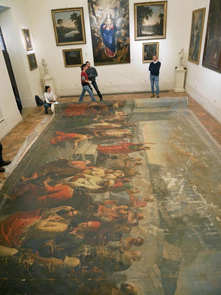 L’intention initiale de mener un chantier pédagogique articulant les interventions de deux écoles de restauration, l’Istituto per il restauro (ICR) en Italie et l’Institut du Patrimoine (INP), n’a pas pu se réaliser. C’est à quatre jeunes diplômées de l’ICR que la restauration a donc été confiée, en février 2024, sous la direction de Barbara Lavorini (restauratrice fonctionnaire de l’ICR). Les fragilités de la toile, d’une seule pièce19 – ce qui a été respecté au rentoilage –, les nombreuses usures de la couche picturale sur une préparation très fine mais dont l’incidence s’est avérée relativement mineure sur la lecture générale des tonalités – notamment dans les ciels – ont été autant de paramètres à intégrer. Les opérations de rentoilage ont été particulièrement délicates.