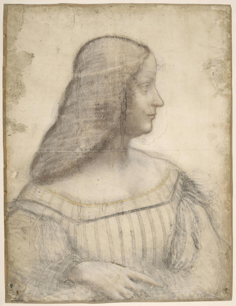 Léonard de Vinci (1452-1519), Portrait d’Isabelle d’Este, vers 1499-1500. Pointe métallique, charbon de bois, sanguine et estompe, craie ocre jaune, rehauts de blanc sur le visage, la gorge et la main, 61 x 46,5 cm. Paris, département des Arts graphiques du musée du Louvre.