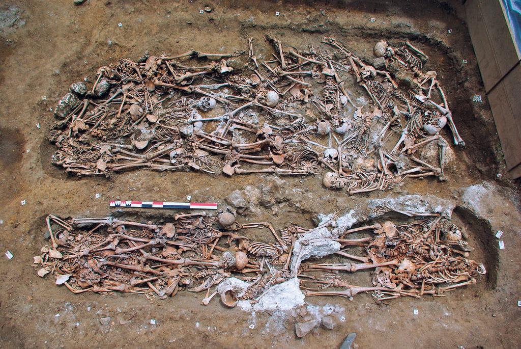 Vue des charniers 8 et 9 de la bataille du Mans (12-13 décembre 1793) en cours de fouille. © E. Cabot, Inrap