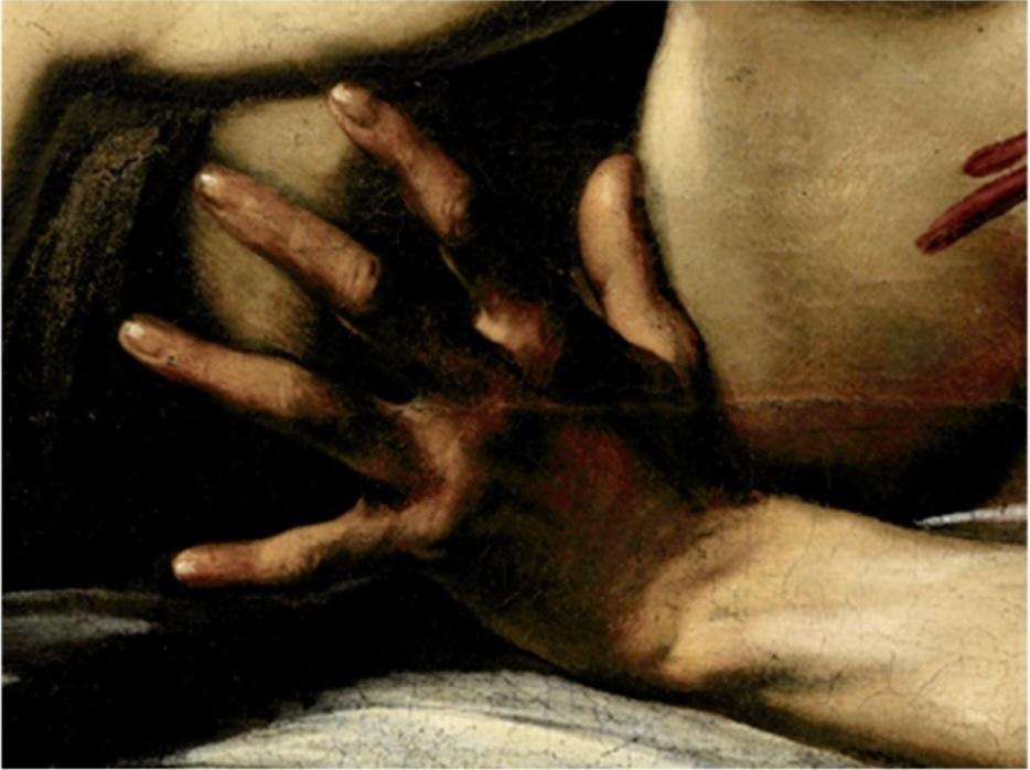 Plusieurs éléments techniques coïncident avec ce que l’on connaît de la manière de Caravage : l’usage de la préparation brune laissée en réserve entre l’ombre et la lumière, l’absence de dessin préparatoire, l’utilisation d’incisions à la manière d’un graveur et le large cerne noir autour des deux personnages principaux. On voit par ailleurs que les coups de brosse sont très rapides, et parfois très amples comme dans la draperie rouge. Or Caravage est un artiste qui peint vite…