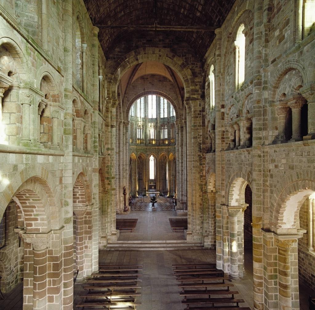 Les plus anciennes sont de superbes chapiteaux romans et des statues d’anges musiciens du XIe siècle. C’est en effet dans les premières décennies de ce siècle, sous l’abbatiat de Hildebert, que l’église est construite au sommet du rocher, à 80 m au-dessus du niveau de la mer. Elle s’appuie sur un réseau souterrain formé par des constructions antérieures, comme l’église carolingienne qui prend le nom de Notre-Dame-sous-Terre, et par des cryptes servant de chapelles, bâties pour supporter les bras du transept, comme les cryptes Saint-Martin et Notre-Dame-des-Trente-Cierges. Le décor des chapiteaux, constitué de volutes et d’animaux fantastiques, est comparable aux enluminures ornant les manuscrits qui font la réputation du scriptorium (atelier où sont réalisés les manuscrits) du Mont-Saint-Michel. Ces œuvres proviennent du chœur roman dont la voûte s’effondre en 1421. Ce dernier est reconstruit en style gothique flamboyant après la guerre de Cent Ans, son élévation et sa luminosité offrant un saisissant contraste avec la nef romane, plus sombre et austère.