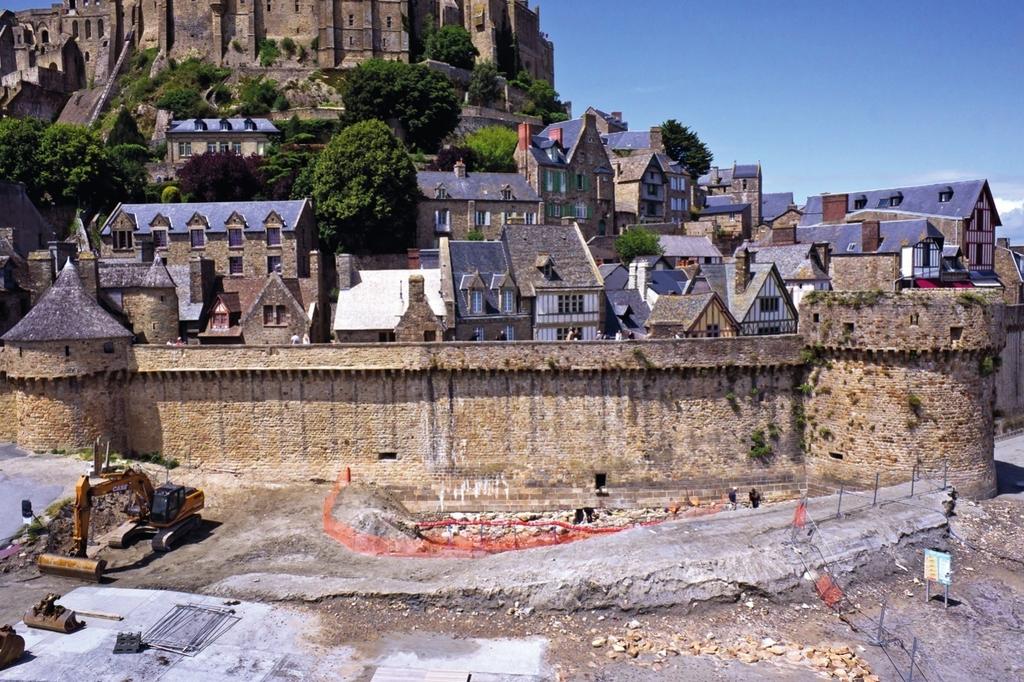 En contrebas de l’abbaye, de nombreuses campagnes de fouilles menées ces dernières décennies par l’Inrap dans le village apportent de nouvelles informations sur l’histoire militaire et civile du Mont. Un atelier de fabrication d’enseignes de pèlerinage, avec des moules en schiste datés des XIVe-XVe siècles, a été mis au jour en 2005 et éclaire l’activité artisanale liée à l’afflux de pèlerins. En 2011, les archéologues ont révélé les vestiges de la tour Denis, ouvrage édifié vers 1479 et détruit en 1732 qui faisait partie du système de fortifications. En 2015, ce sont d’anciennes maisons médiévales, détruites en 1368, qui ont été étudiées. Enfin, la recherche des fortifications et de la porte du XIIIe siècle a permis la découverte fortuite du cimetière paroissial que l’on pensait avoir été détruit en 1913. Bien que bouleversée par les aménagements postérieurs, la trentaine de sépultures livre de précieuses informations sur la population du village médiéval (voir aussi notre article dans Archéologia no 553, avril 2017).