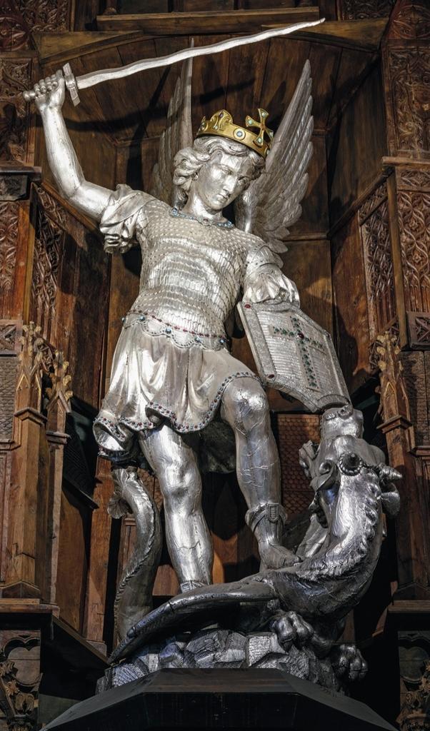 Jean-Alexandre Chertier (actif entre 1857 et 1896 à Paris), Saint Michel terrassant le dragon, 1873. Argent sur âme de bois. Le Mont-Saint-Michel, église paroissiale Saint-Pierre. © Archives départementales de la Manche, Alexandre Poirier
