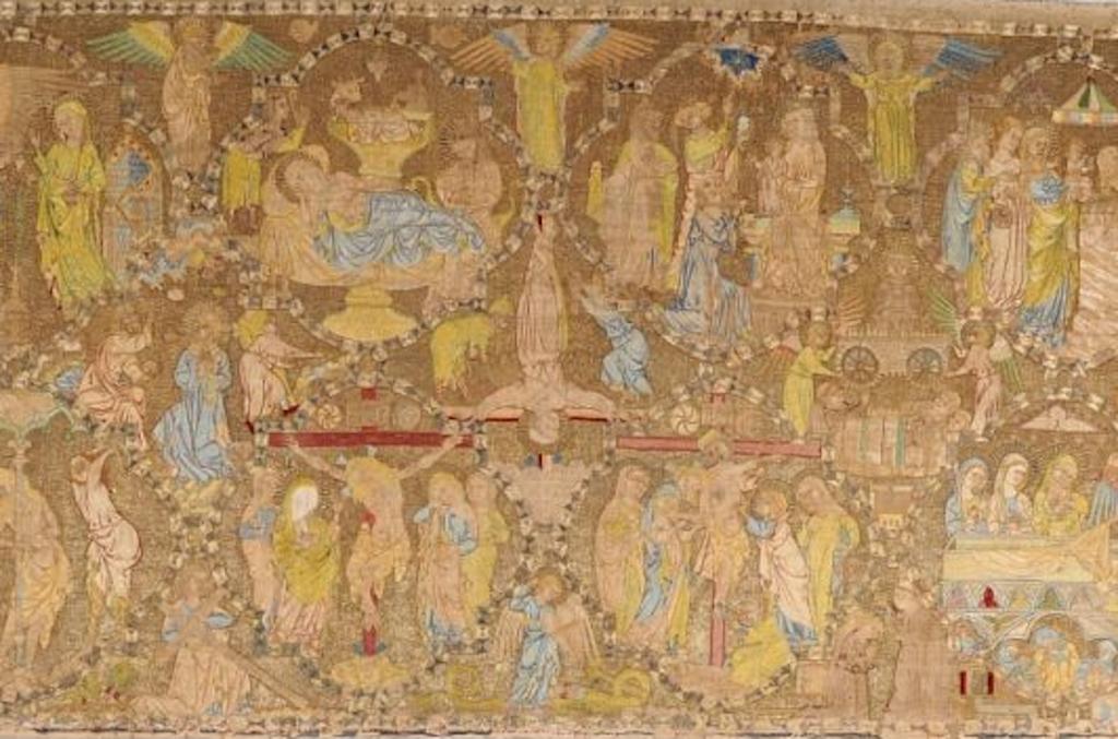 Chef-d’œuvre des collections, ce parement d’autel somptueusement brodé provient des Cordeliers de Toulouse. Il date de la première moitié du XIVe siècle, époque où les frères mendiants, installés à Toulouse depuis 1222, initièrent une réforme visant à revenir à une observance stricte de la règle de saint François. Lors de sa restauration à la Fondation Abbeg en Suisse, bien que lacunaire, la broderie du XIVe siècle est apparue intacte par endroits sous les reprises du XIXe siècle.