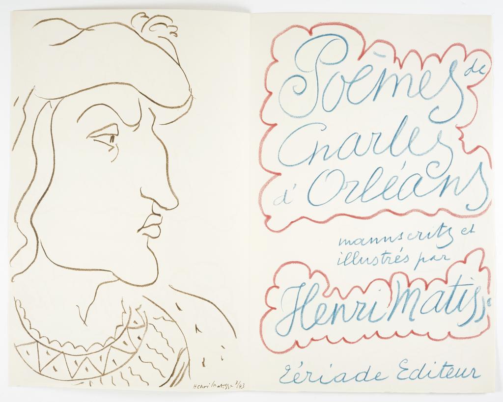 Henri Matisse (1869-1954), Poème de Charles d’Orléans, frontispice et page titre, 1950. Lithographie sur vélin d’Arches. Don Alice Teriade, 2000.Le Cateau-Cambresis, musée départemental Matisse. Photo service de presse. Photo service de presse. © Succession H. Matisse / Photo Musée départemental, Philip Bernard