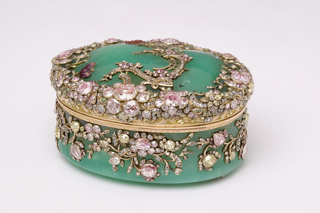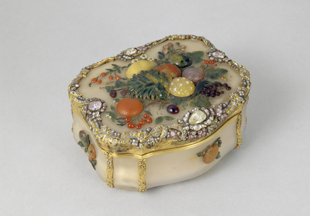 Tabatière, anonyme, Berlin, vers 1765. Chrysoprase, or, cornaline, diamants, feuilles de métal, 5 x 10 x 7,8 cm. Londres, collection Rosalinde & Arthur Gilbert en dépôt au Victoria and Albert Museum (LOAN: GILBERT.412-2008). Photo service de presse. © Victoria and Albert Museum