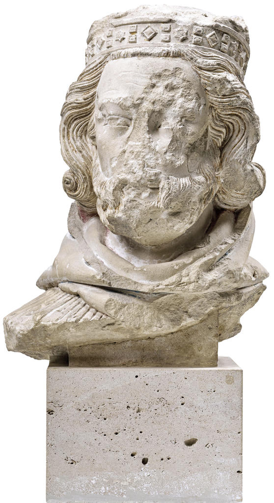 Tête du roi David ou de Pépin le Bref, provenant de la galerie des rois (façade occidentale), vers 1220. Calcaire lutétien, traces de polychromie, H. 43 ; L. 32 ; P. 35 cm. Paris, musée de Cluny – musée national du Moyen Âge. Photo service de presse. © RMN (musée de Cluny – musée national du Moyen Âge) – R.-G. Ojeda