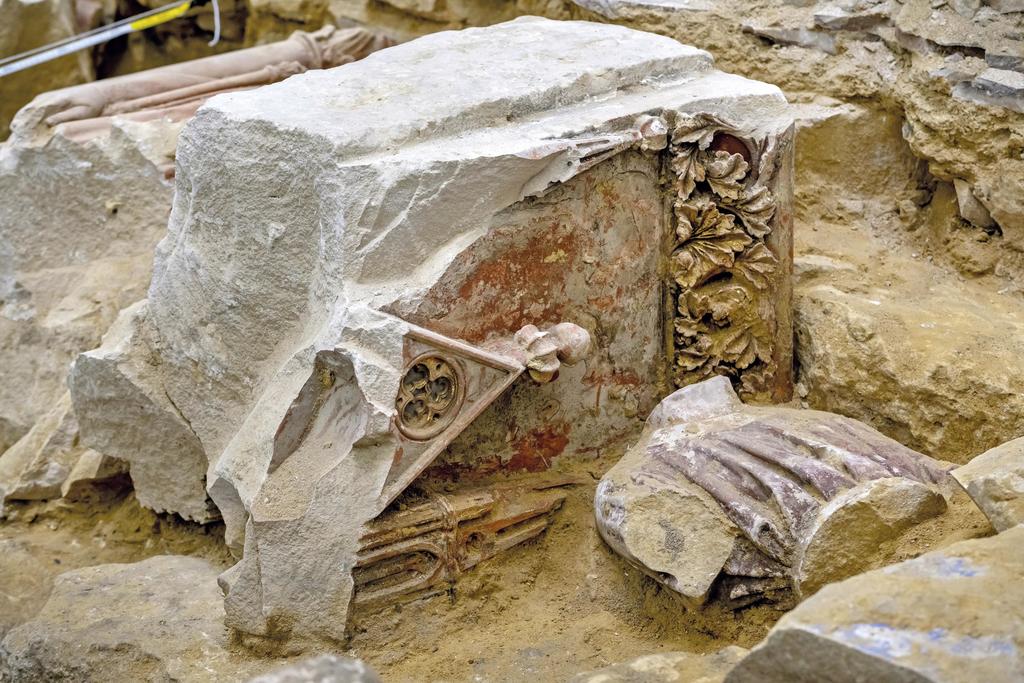 Décor de microarchitecture du jubé issu des fouilles de la croisée du transept, vers 1230. Photo service de presse. © Inrap – D. Gliksman