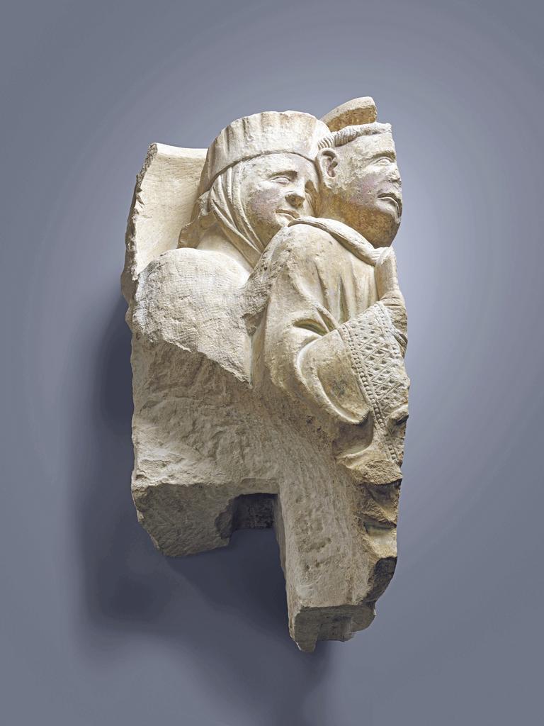 Deux damnés du linteau supérieur du portail du Jugement dernier, vers 1210-20, fragment déposé en 1853. Calcaire lutétien, traces de polychromie, H. 82 ; L. 41 ; P. 30 cm. Paris, musée de Cluny – musée national du Moyen Âge. © RMN (musée de Cluny – musée national du Moyen Âge) – M. Urtado