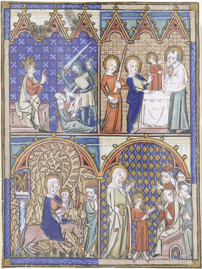 Feuillet enluminé d’un manuscrit démembré : le Massacre des Innocents, la Présentation au Temple, la Fuite en Égypte, le Christ parmi les docteurs, vers 1340. Parchemin enluminé, 18,6 x 14 cm. Paris, musée de Cluny – musée national du Moyen Âge. Photo service de presse. © RMN (musée de Cluny – musée national du Moyen Âge) – M. Urtado