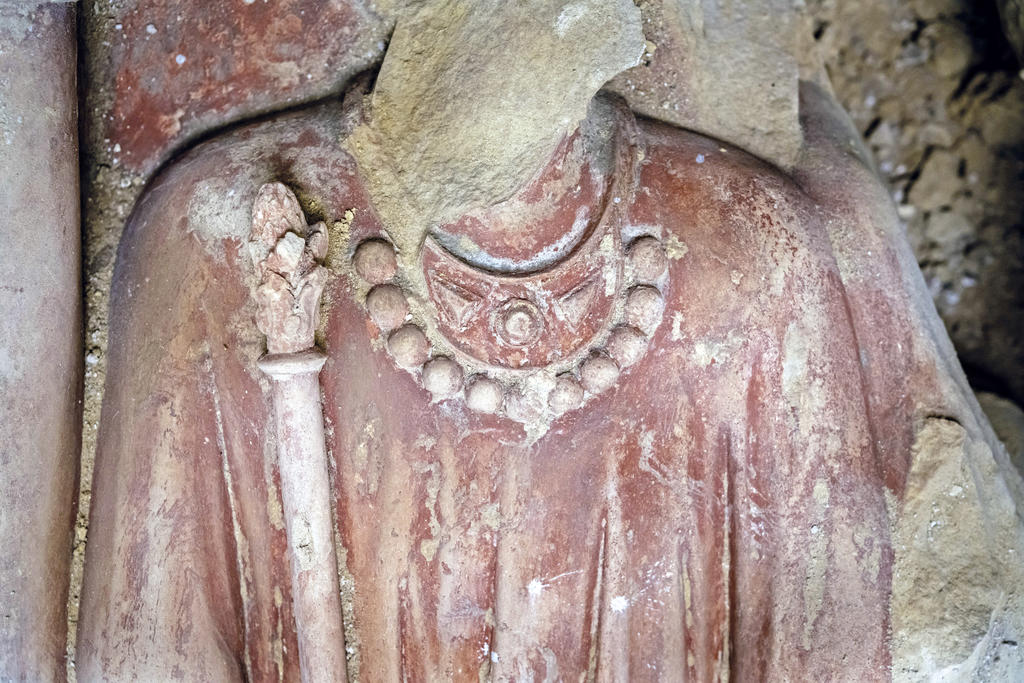 Revenons sur la polychromie des fragments découverts. Y en a-t-il aussi des traces sur d’autres éléments connus du décor ?