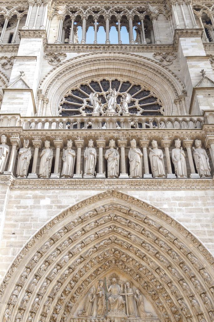 L’histoire commence, en réalité, avant même qu’on ne lance le chantier de la cathédrale actuelle : on remploie des sculptures datées vers 1145, or la première pierre de la nouvelle cathédrale est posée en 1163. L’insertion de ces éléments du premier art gothique intervient peu après 1200. On peut distinguer huit ensembles sculptés principaux qui se succèdent à Notre-Dame. Les trois premiers sont les trois portails de la façade occidentale : le portail Sainte-Anne, où ont été insérés les éléments du milieu du XIIe siècle ; son pendant, le portail du Couronnement de la Vierge, du nom de la scène qui est représentée au tympan ; le portail central, dédié au Jugement dernier. Tous trois sont couronnés par la galerie des rois, qui barre la façade occidentale à l’étage du dessus, sous la rose. Vingt-huit statues de 3,70 m de haut la composent (vingt et une têtes des statues d’origine sont conservées au musée de Cluny). Le jubé, lui, a été sculpté dans les années 1230. Délimitant l’espace accessible au commun des mortels et le sanctuaire où se trouve le clergé, il faut l’imaginer comme une façade intérieure masquant le saint des saints.