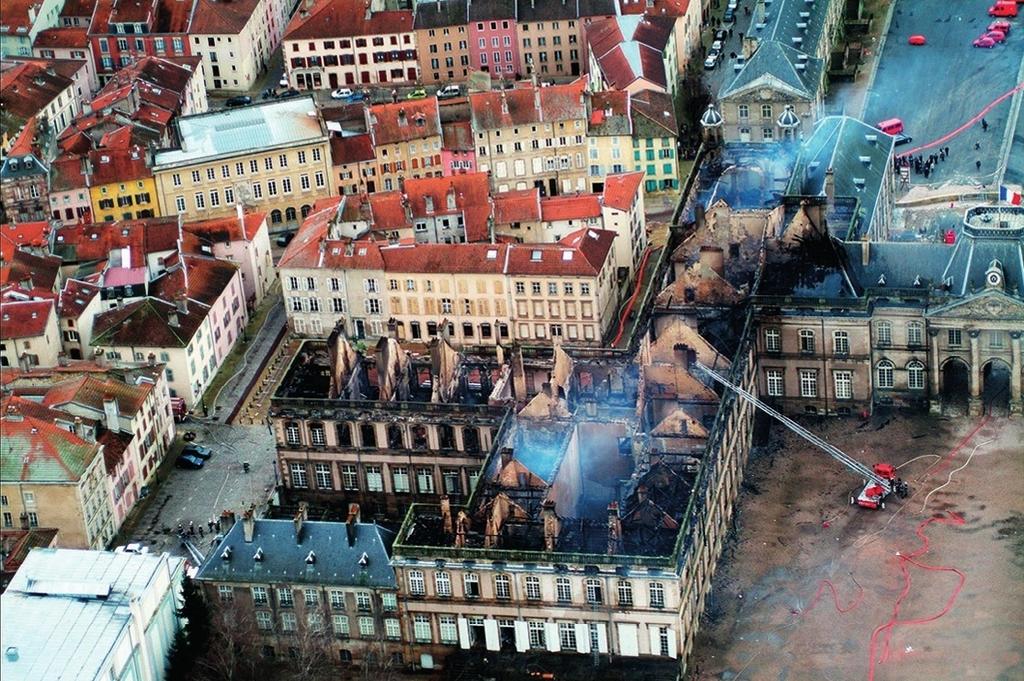 Voulu par le duc Léopold Ier, qui le commanda à Germain Boffrand, et parachevé par Stanislas, qui y fit travailler Héré, le château de Lunéville, le fameux « Versailles lorrain », semble être maudit : pas moins de sept incendies ont en effet frappé l’édifice : en 1719, 1739, 1759, 1789, 1814, 1849, 1961 enfin, où une partie de la toiture fut brûlée. Pourtant, cette série n’était pas terminée… Alors que les festivités de fin d’année viennent de s’achever, dans la nuit du 2 au 3 janvier 2003, le château de Lunéville est dévoré par les flammes, attisées par un fort vent : provoqué par un court-circuit électrique dans la chapelle, l’incendie détruit tout sur son passage, bâtiments et collections. La chapelle ducale s’effondre sur elle-même, tandis que toute l’aile sud est brûlée : la bibliothèque militaire avec ses 8 000 volumes, le musée de la faïencerie et ses riches collections, enfin les appartements ducaux donnant sur le jardin sont anéantis. Malgré l’héroïsme des pompiers et des bénévoles, dont la chaîne a permis le sauvetage de nombreuses œuvres d’art, les Lorrains sont sous le choc : ils pleurent la destruction partielle du château lié au bon roi Stanislas, que le département de Meurthe-et-Moselle venait de racheter en partie en 2000, le reste appartenant encore à l’Armée. Un élan de solidarité national se manifeste, les dons affluent et passent par la jeune Fondation du Patrimoine, déjà, tandis que l’association « Lunéville, château des Lumières », organise de nombreuses manifestations. L’incendie est l’occasion, comme toujours, de faire des observations archéologiques sur l’édifice, et notamment de comprendre le système constructif de la chapelle de Boffrand. Le chantier, le plus grand d’Europe durant quelques années, est confié à l’architecte en chef Pierre-Yves Caillault, qui privilégie un retour à l’état XVIIIe siècle et l’usage de matériaux anciens, avec de nouvelles charpentes en bois. Les travaux se montent à cent millions d’euros, soit un des courts-circuits les plus chers de l’histoire de France, et leur achèvement complet n’est prévu qu’en 2023, vingt ans après le drame.