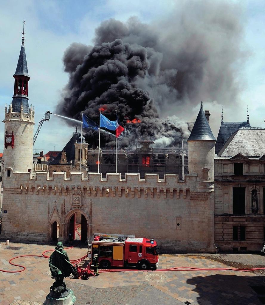 Considéré comme l’un des plus beaux de France, et occupé par le corps municipal depuis 1298, l’hôtel de ville de La Rochelle a été édifié aux XVe et XVIe siècles, dans un style richement orné mêlant le flamboyant et la Renaissance. Une partie de l’édifice, classé Monument historique dès 1861, date de la fin du XIXe siècle, quand il est restauré et agrandi en « style », suivant la tradition du service des Monuments historiques. Alors qu’un chantier de restauration s’y déroule, conduit par l’architecte en chef des Monuments historiques Philippe Villeneuve, le bâtiment s’embrase le 28 juin 2013, en plein après-midi : heureusement, aucun mort n’est à déplorer. La partie la plus touchée est également la plus ancienne, dont la grande salle. Si on sauve heureusement plusieurs œuvres d’art conservées à l’intérieur, tableaux et objets, les dégâts sont très importants : provoqués par un problème électrique, ils ont occasionné la perte de 70 % du bâtiment. Les travaux doivent donc reprendre et un nouveau chantier s’ouvre alors : il s’achève à peine cet hiver, soit six ans et demi après le drame. L’inauguration doit faire l’objet de grandes festivités populaires. Étrange coïncidence : c’est de retour de La Rochelle, dans un TGV, que l’architecte en chef a appris que Notre-Dame, dont il était également chargé, était en flammes. Le mauvais œil ?