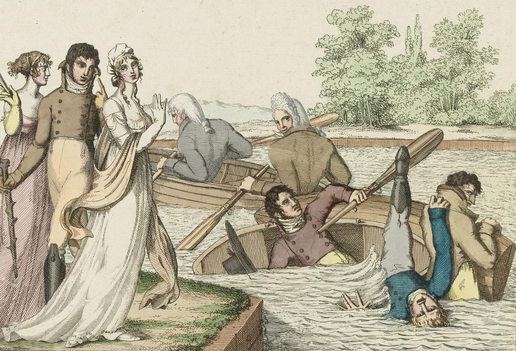Claude-Louis Desrais (1746-1816), Amusement du Hameau de Chantilly ou le naufrage. Estampe couleur, 23,7 x 29,2 cm. Caricatures parisiennes, Le Goût du Jour no 3, A Paris, chez Martinet, libraire rue du Coq S.t Honoré. Chantilly, musée Condé. Photo service de presse. © GrandPalaisRMN (château de Chantilly) / Michel Urtado