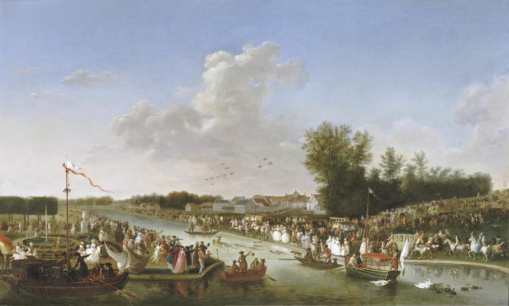 Anonyme (XVIIIe siècle), d’après Jean-Baptiste Le Paon (vers 1736-1785), Chasse au cerf offerte au comte et à la comtesse du Nord dans le parc de Chantilly, 12 juin 1782 ; hallali dans le Grand Canal. Copie réalisée en Russie de l’original peint entre 1783 et 1785. Huile sur toile, 98 x 160 cm. Chantilly, musée Condé. Photo service de presse. © GrandPalaisRMN (château de Chantilly) / Gérard Blot