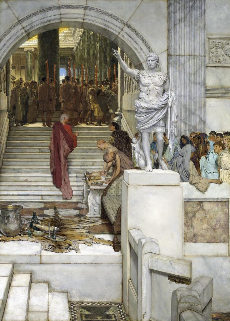Il a fallu plus d’un demi-siècle pour que la peinture d’Alma Tadema revienne du mépris dans lequel le culte de la (sainte) modernité l’avait fait choir. Le musée londonien voit aujourd’hui dans cette acquisition l’occasion de ménager une place au Neoclassicism et à l’Aestheticism, ce qui sonne assurément mieux que « académisme » ou « pompiérisme ». Il est aisé de dauber sur le goût de l’antique « pointilleux » d’Alma Tadema actualisé par l’archéologie (on notera l’utilisation de la statue de Augustus Prima Porta, exhumée en 1863, représentation impériale qui inspire aux solliciteurs une révérence quasi religieuse). On se gardera d’oublier que cet art académique, si déprécié, connut une postérité immense dans un art qui était à venir : le cinéma.