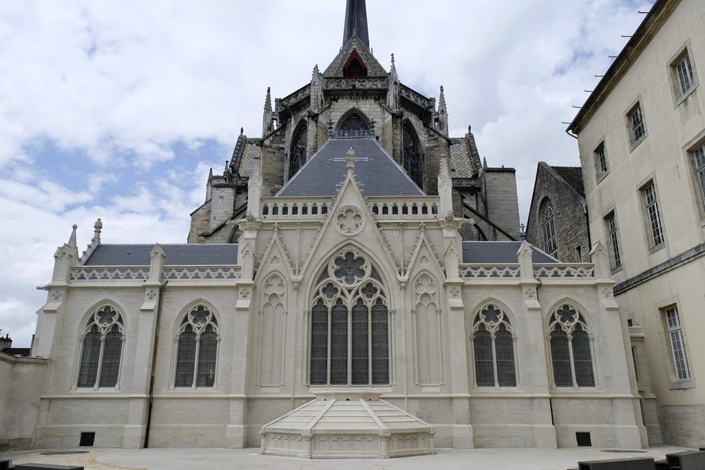 La sacristie néogothique, ajoutée au XIXe siècle lorsque l’abbatiale est devenue cathédrale, a elle aussi été restaurée. La rotonde se trouve sous la sacristie et la cour visible ici. © DRAC BFC