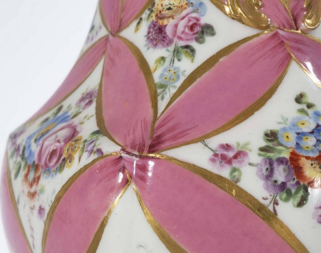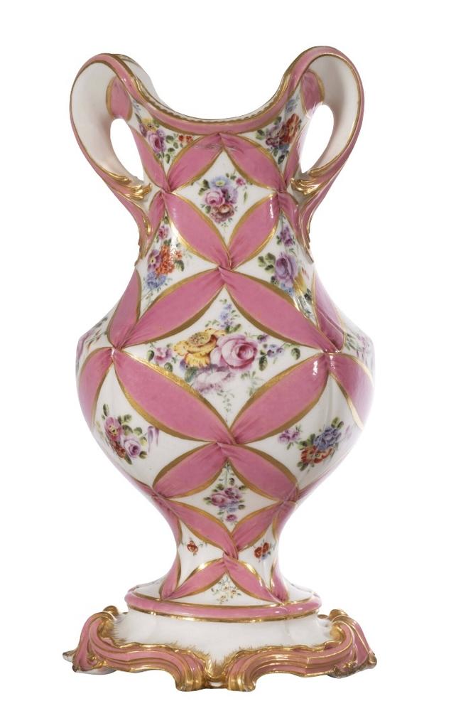 Lors de l’exposition de Versailles en décembre 1758, plusieurs membres de la famille royale furent séduits par des pièces ornées de ce fond qui constituait la grande nouveauté de l’année et qui, semble-t-il remporta un grand succès. Madame Infante acquit ainsi un bougeoir à fond rose pour 60 livres. Ses sœurs, Victoire, Sophie et Louise, achetèrent le même jour des déjeuners carré et triangle à fond rose pour les sommes respectives de 144 et 300 livres. Le roi acquit lui-même six autres pièces à fond rose, notamment deux vases « à oreilles » à rubans roses pour la somme totale de 720 livres ainsi que deux pots à l’eau accompagnés de leurs jattes. Enfin, des princes du sang achetèrent également des pièces à fond rose, notamment le duc d’Orléans (1725-1775) et le prince de Condé (1736-1818). Ce dernier acquit en particulier une célèbre garniture de cinq vases à fond rose, d’une forme exceptionnelle, dispersée à l’époque révolutionnaire mais encore connue aujourd’hui. L’ensemble était composé d’un pot-pourri « à vaisseau », de deux vases candélabres « à tête d’éléphant », conservés au Metropolitan Museum of Art, à New York, et de deux vases « à oreilles », aujourd’hui au musée du Louvre4. Le prince de Condé avait acheté cette somptueuse garniture à l’intention de sa première épouse, Charlotte-Godefride-Elisabeth de Rohan (1737-1760). En effet, l’ensemble est bien décrit en 1760, au n° 133, dans l’inventaire dressé en l’hôtel de la rue de Condé après la mort de la princesse : « Item une garniture de cheminée composée de cinq pièces, la première un vase en forme de vaisseau à cartouche, deux autres vazes aussy à cartouches et deux autres a deux bobèches chacune et peints en mosaïque et fleurs, le tout de porcelaine de Sèvres, fond lilas, le tout prisé Mille livres5 ».