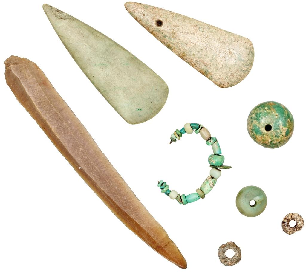 Ensemble mobilier de la sépulture Est de Tuchenn Pol, Ploemeur, Morbihan. Collection Paul du Châtellier, musée d’Archéologie nationale. Perles en callaïs MAN72464A et B, lame de silex MAN73725, haches en jadéite MAN73726 et MAN73727, perle en calcédoine MAN73730, perles d’ambre MAN731A et B. © RMN-Grand Palais (musée d’Archéologie nationale) / Franck Raux / SP