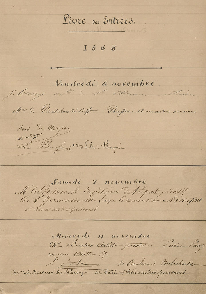 Registre d’entrée des visiteurs, 1868-1876. © MAN, centre des archives