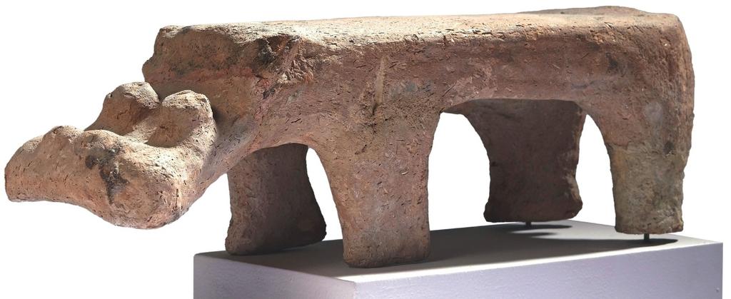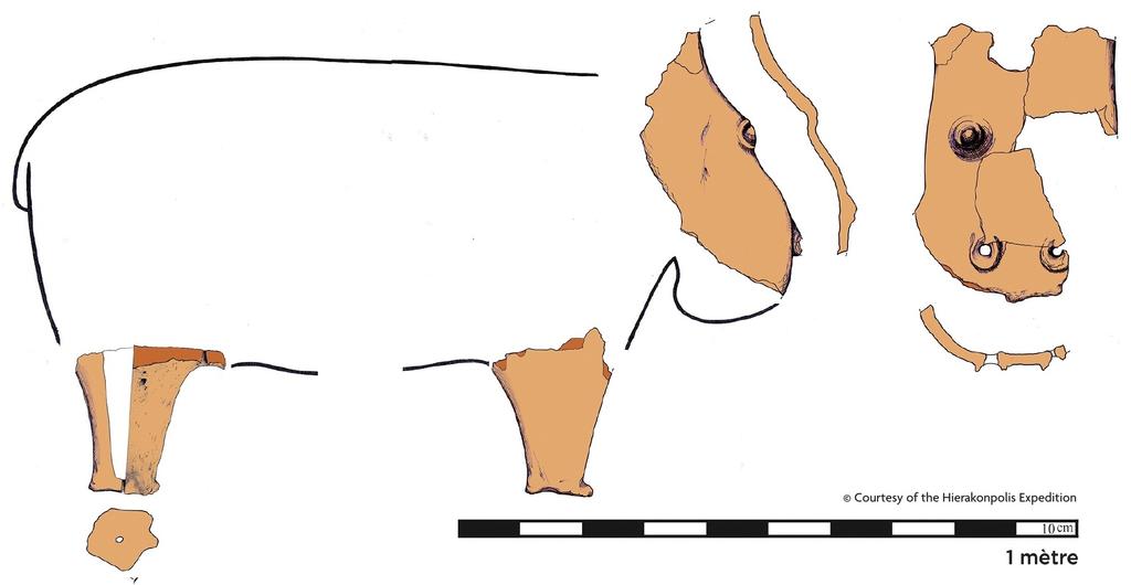 L’époque prédynastique a fourni une documentation iconographique extrêmement abondante et variée à propos de cet animal. Les tombes de l’époque de Nagada I (3900-3650 avant notre ère environ) et du début de Nagada II (3650-3300 avant notre ère environ) ont livré un grand nombre de vases de type White Cross-lined (à engobe rouge et décor de croisillons peints en blanc) ornés d’un ou plusieurs de ces animaux parmi des végétaux stylisés ou de scènes de chasse au harpon. Ces dernières symbolisent la nécessaire maîtrise des forces chaotiques, incarnées par l’hippopotame. La statuette d’hippopotame en terre cuite du musée d’Archéologie nationale (MAN), longue de 36,5 cm et large de 12 cm, appartient à une série plus rare en raison de sa grande taille. Fabriquée en limon du Nil avec un dégraissant végétal, elle offre une version très reconnaissable, bien que stylisée, de l’animal : les pattes sont épaisses et la tête présente à la fois le large mufle si caractéristique avec des naseaux en surépaisseur, des yeux proéminents et de petites oreilles dont l’une est brisée. Au lieu d’une forme rebondie, le corps ressemble à une sorte de tablette horizontale épaisse dont la surface aurait été soigneusement régularisée. Jacques de Morgan a publié l’objet après l’avoir acheté à un marchand de Qeneh (actuelle Qena, Haute-Égypte) comme provenant de Toukh, importante nécropole du site de Nagada. Longtemps sans comparaison directe, cette statuette a parfois suscité des doutes sur son authenticité mais la découverte, en 2018 à Hierakonpolis, à proximité de la tombe 111 du cimetière HK6, des vestiges d’une étonnante statue, incite à la réexaminer. Cet autre exemplaire, extrêmement fragmenté, a été entièrement fabriqué dans du limon du Nil mêlé à de nombreuses inclusions de paille et de fragments minéraux. Exceptionnelle, sa taille est estimée à 1,50 m ou 2 m et pourrait correspondre à celle d’un jeune hippopotame. Faites séparément, les pattes de section circulaire et creuses ont été fixées au corps avant cuisson et des perforations situées près des lignes de joint indiqueraient la manière dont les différentes parties ont pu être fixées ensemble et renforcées. Cette spectaculaire création a demandé une remarquable maîtrise technique dont il est encore difficile de préciser la datation, puisque des sculptures analogues sont connues tout au long de l’époque prédynastique et jusqu’aux premières dynasties. La taille et le mode de fabrication de la statue de Hierakonpolis peuvent être rapprochés de ceux d’une tête d’hippopotame de 50 cm de long environ, en terre cuite grossière, trouvée à Qustul en Nubie (Égypte), en association avec des tombes datées de l’époque de Nagada III ((3300-3150 avant notre ère environ). La zone de la nécropole HK6 de Hierakonpolis ayant livré les vestiges d’une installation à usage rituel à l’époque prédynastique, remaniée au Nagada III, il est envisageable que cette grande statue ait pu être exposée sur une terrasse surélevée, à l’extrémité du cimetière HK6 tel un gardien du monde des morts. Vu sa qualité d’exécution, son état de conservation et ses proportions, la statuette du MAN pourrait être rattachée à cette série d’objets hors du commun et avoir rempli un rôle analogue au sein de l’une des tombes de la nécropole de Toukh.