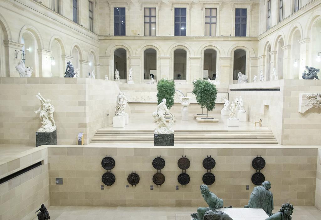 Dans la cour Puget, au musée du Louvre, sont exposés les chefs-d’œuvre de Pierre Puget, Milon de Crotone (1672-1682, au centre) et L’Enlèvement d’Andromède par Persée (1679-1684, à gauche). Le Chef de saint Jean-Baptiste sera accroché à proximité. © Adobestock