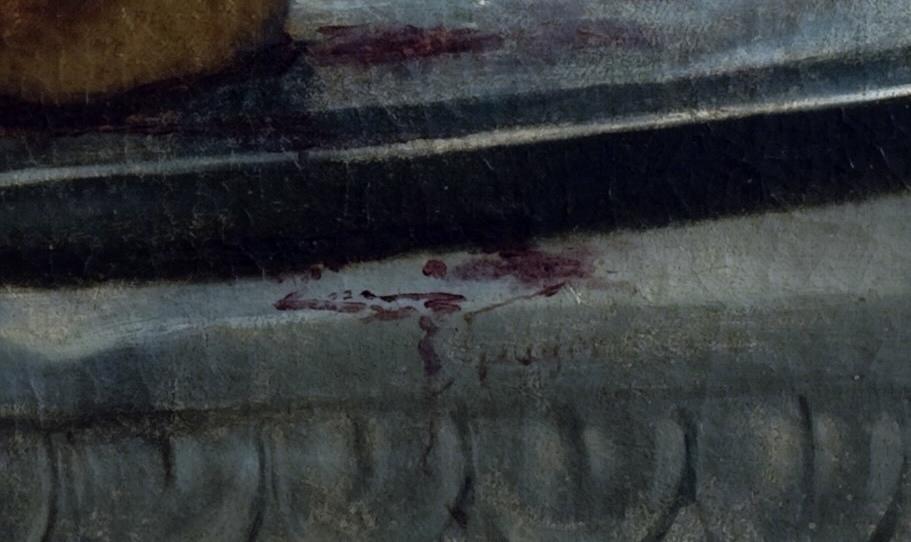 Détail de la signature du Chef de saint Jean-Baptiste par Pierre Puget, vers 1675-1680. Huile sur toile, 46,5 x 71 cm. Paris, département des Peintures du musée du Louvre. © DR