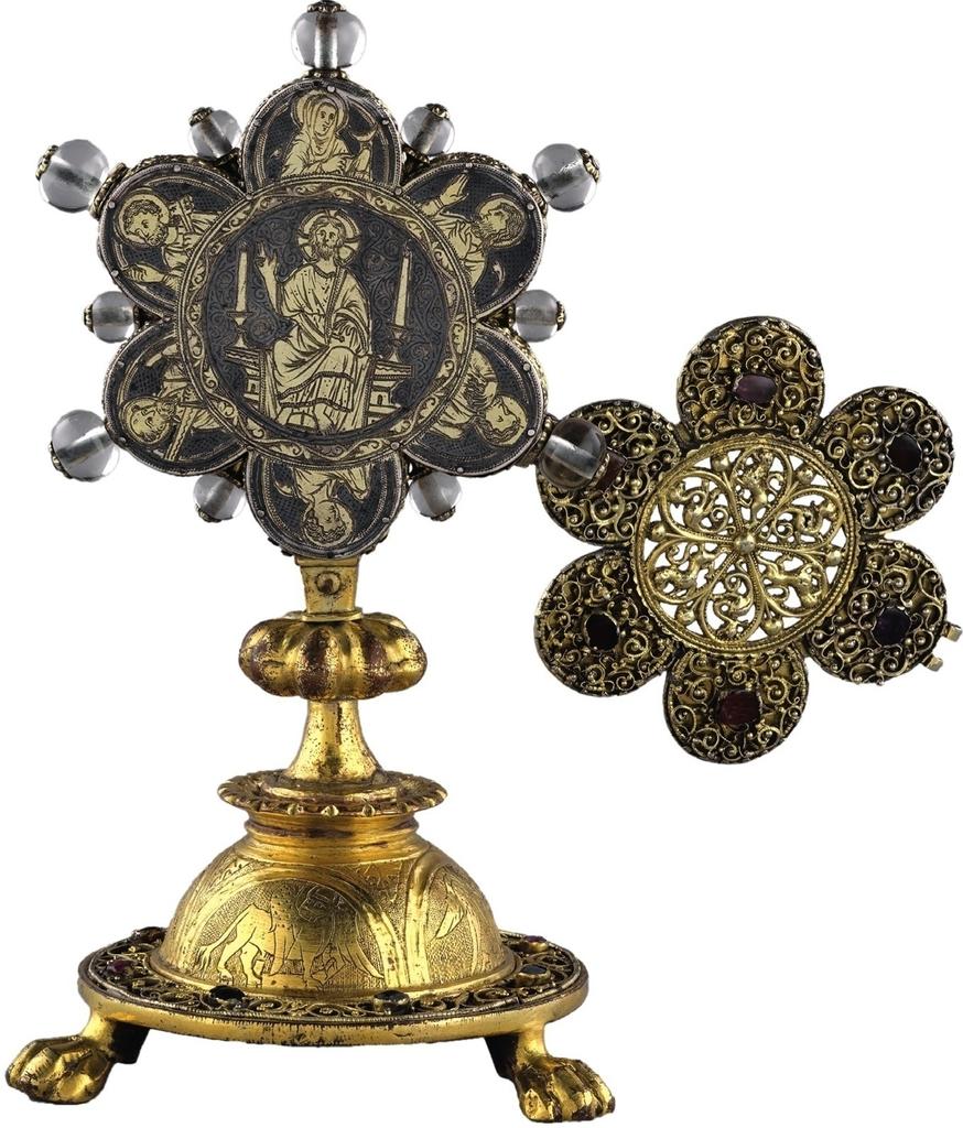 Peut-être créé pour l’église Notre-Dame de Termonde (Dendermonde) en Flandres, cet objet est un « phylactère », type de reliquaire polylobé de faible épaisseur suspendu ou posé sur un pied. La plupart des exemplaires connus ont été produits dans les régions septentrionales entre 1150 et 1250. Cet exemplaire conserve un fragment présumé de la Vraie Croix. Il figure le Christ en majesté, entouré de bustes de saints et d’allégories, de la lune et du soleil. Le pied et les boules en cristal seraient un ajout du XIXe siècle.