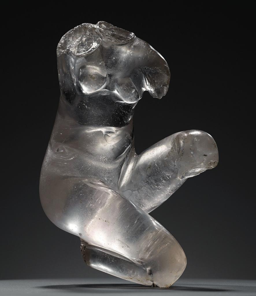Dès l’Antiquité, la compréhension des formes cristallines passionne les scientifiques. Au Ier siècle avant notre ère, l’historien et géographe grec Strabon parle, le premier, de krystallos (« glace » en grec ancien), en associant ce matériau aux cristaux de neige. Ce dernier connaît alors un rayonnement extraordinaire dans le monde antique. Bien que très difficile à sculpter, ce qui augmente d’autant plus la préciosité de l’objet, le cristal de roche sert à reproduire les grands chefs-d’œuvre de l’époque, souvent en modèle miniature, comme cette Vénus, reprenant le modèle de la Vénus dite de Rhodes, sans doute objet de délectation de son riche propriétaire.